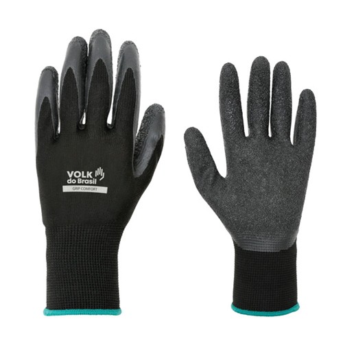 Revestida em látex corrugado na face palmar e ponta dos dedos, punho com fibras elásticas, acabamento em fibras sintéticas.